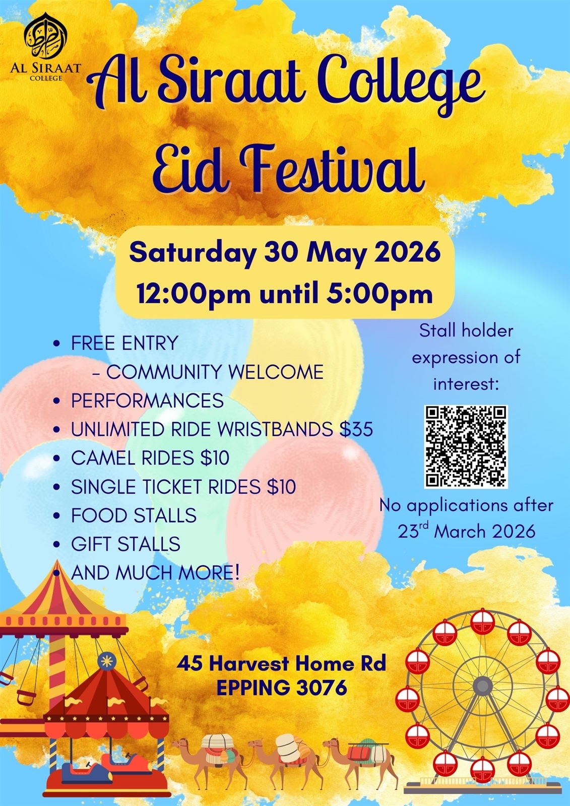 Al Siraat is delighted to announce our upcoming Eid Al-Adha Festival, to be held on Saturday, 30 May 2026. This much-loved annual festival is a wonderful opportunity for our wider community to come together in a vibrant, family-friendly atmosphere filled with celebration, connection and fun.