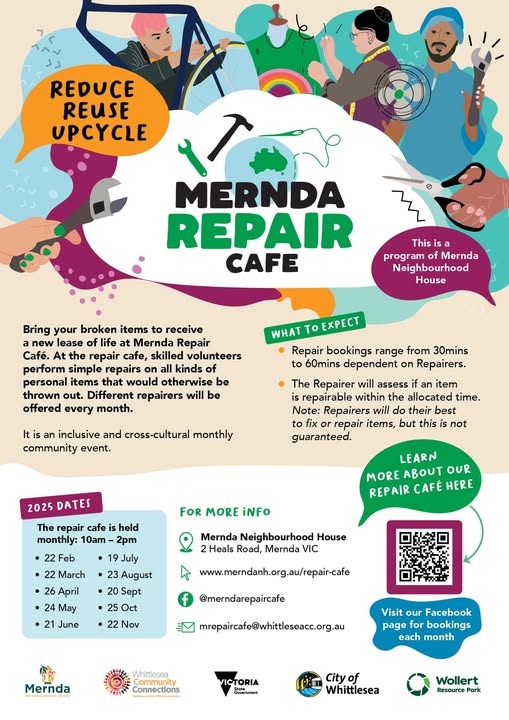 This is a FREE community service, helping reduce waste and bring neighbours together through skill-sharing and sustainable practices. Come along, learn a new skill, and help create a more sustainable Mernda. Everyone is welcome!