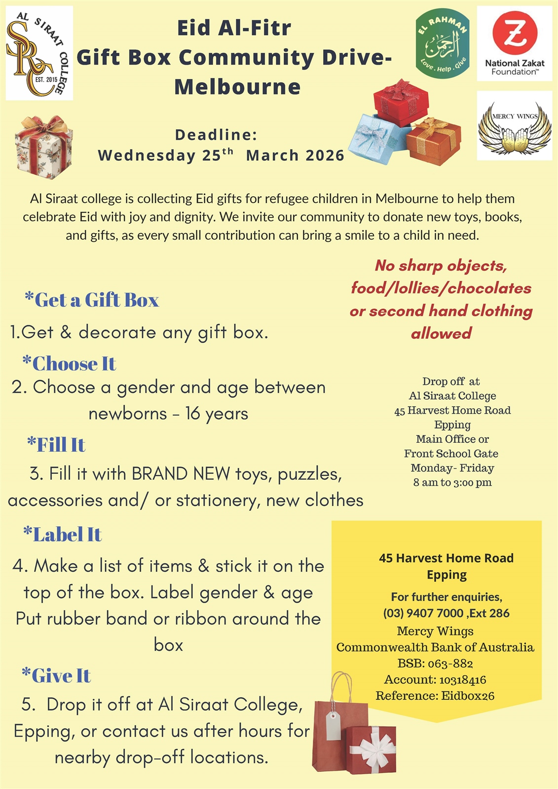 As we are fast approaching Eid Al-Fitr, our Student Representative Council (SRC) warmly reminds our community of the ongoing Eid Toy Drive, a cherished initiative that brings joy and hope to underprivileged refugee children across Melbourne.